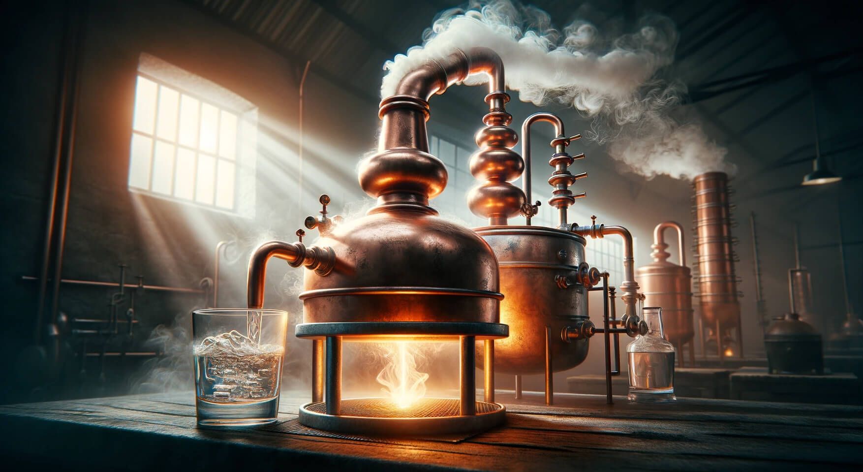 El líquido fermentado, ahora con alcohol, se calienta en un alambique. Al calentarse, el alcohol y otros compuestos volátiles se vaporizan debido a sus bajos puntos de ebullición. Estos vapores ascienden por el alambique, pasando por varias etapas de refinamiento y separación.